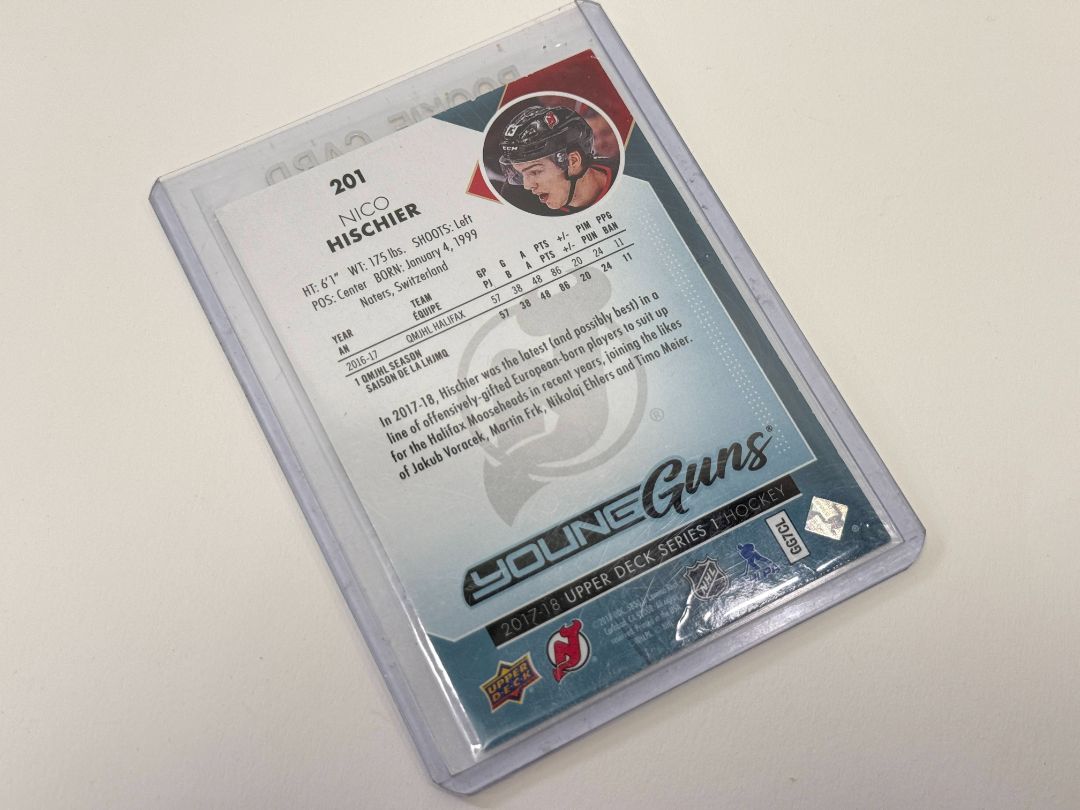 First overall pick in the 2017 NHL Draft? Yeah, that’s Nico Hischier. This is his official Young Guns rookie card from the 2017-18 Upper Deck set, card #201. Suiting up for the New Jersey Devils, Hischier’s been a cornerstone player—and this card’s a must-have for Devils fans or rookie card hawks keeping tabs on future Hall hopefuls. Sleeved and top-loaded since day one. It looks mint, but we’re not PSA—so grade it yourself if that’s your thing. No damage, no drama.