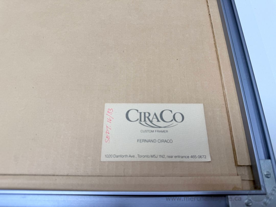 This piece is professionally framed and labeled on the back by CiraCo Custom Framer (Toronto), dated September 16, 1983, indicating period framing rather than a recent reframe. Glass is in excellent condition, with no cracks or chips.