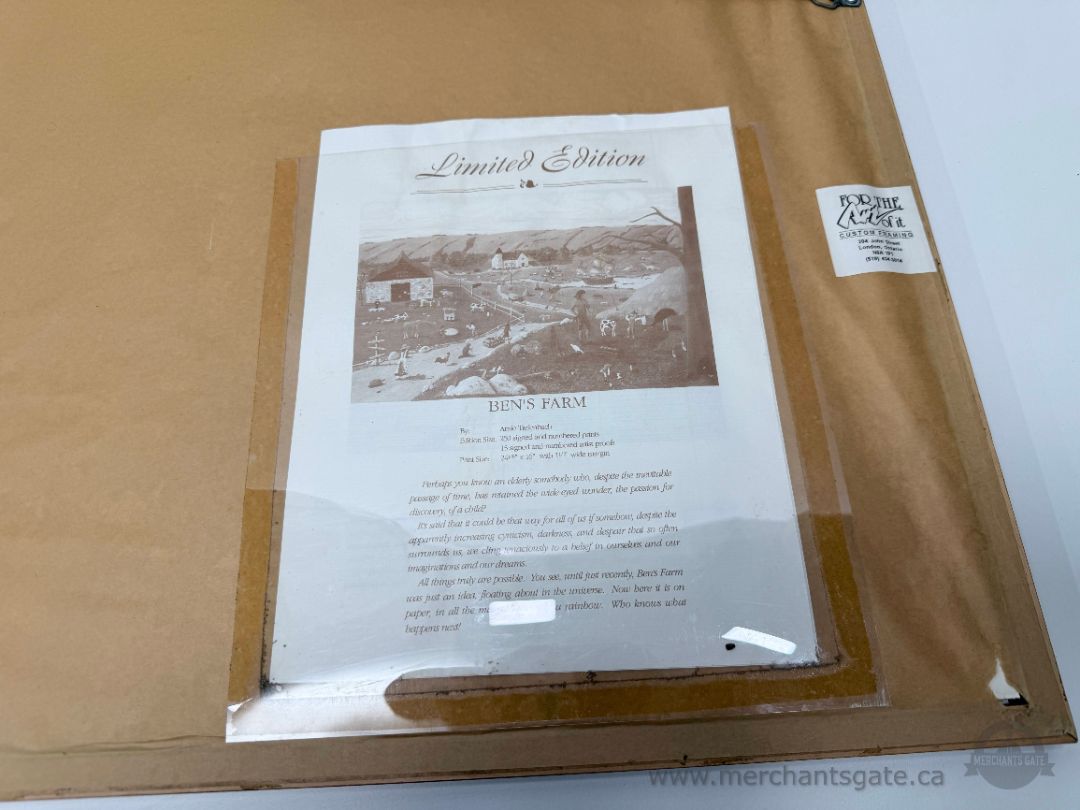 Limited edition art print titled “Ben’s Farm” by Arnie Tiefenbach, signed and numbered 18/250. The artwork features a detailed rural scene with animals, figures, and landscape elements throughout.
