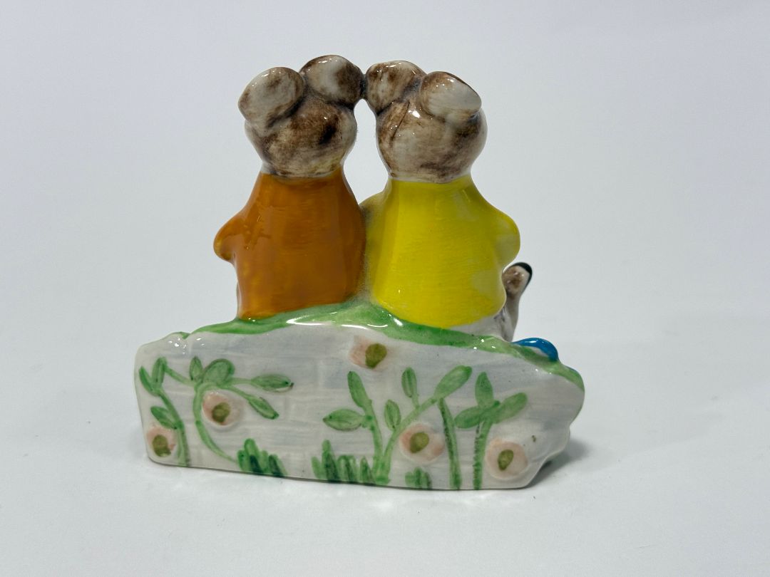 Vintage Beswick England ceramic figurine titled "A Double Act" by Kitty MacBride, featuring two well-dressed mice clearly on their way to steal hearts... or cheese. Hand-painted with bright coats (yellow and orange, because fashion), dainty little shoes, and adorable floral accents. Marked on the base with model number 2527 and all the proper backstamps, because Beswick didn’t mess around when it came to rodent couture. Stands about 3.5" wide and in excellent vintage condition no chips, no cracks.