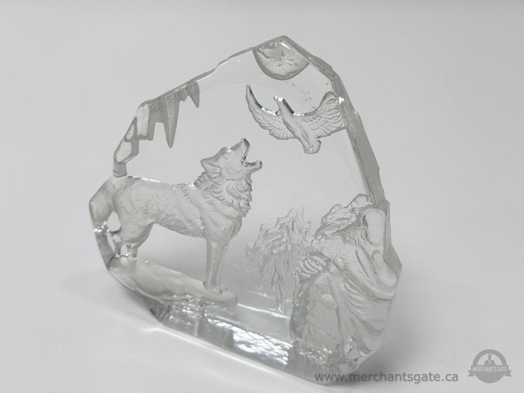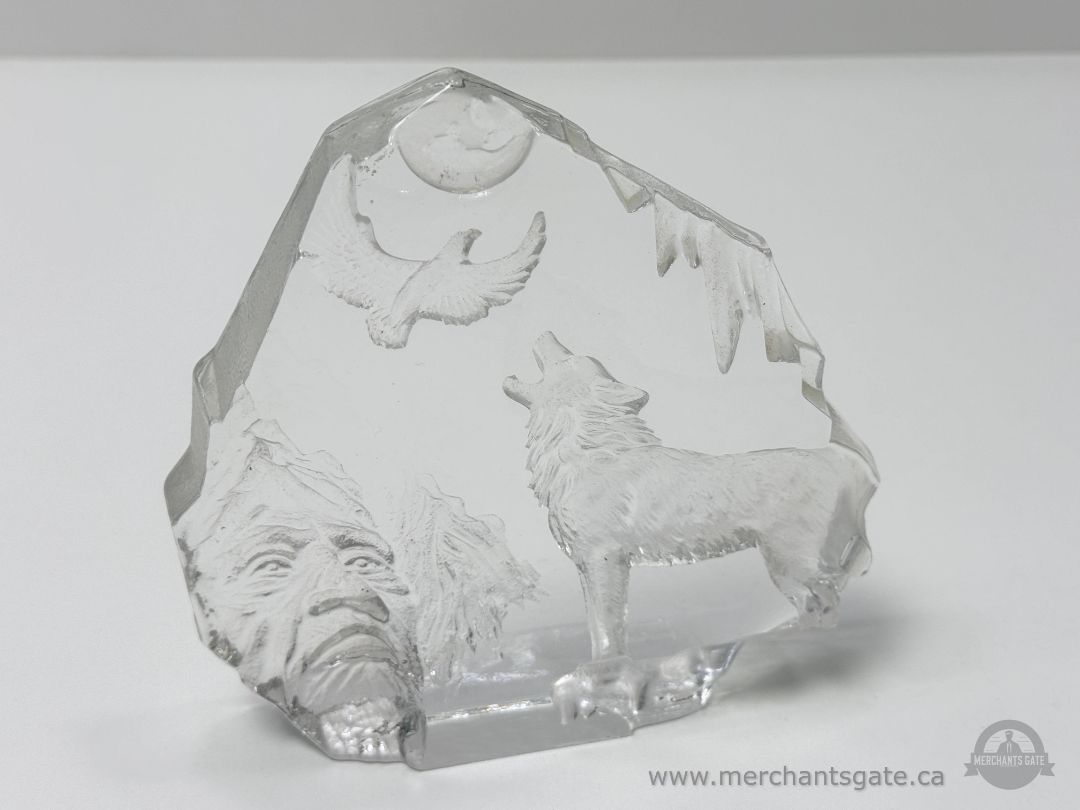Clear Glass Wolf and Eagle Sculpture with Mountain Scene Indigenous Face Art