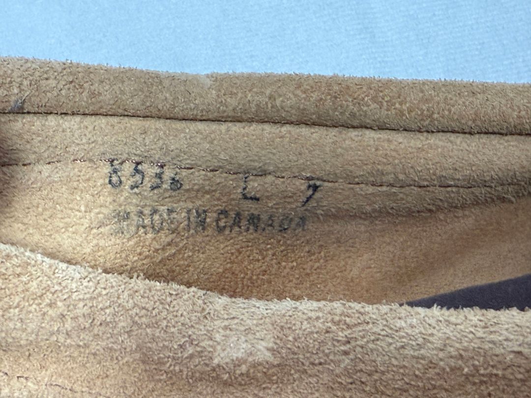 Handmade-style suede moccasins by Laurentian Chief, proudly made in Canada—back when “Made in Canada” still meant something. Features durable rubber soles with an eagle imprint for maximum grip on hardwood, tile, or the metaphorical ice rink of life. Beaded floral design on the toe because subtle flair never hurt anyone. Size is approximately a women's 7 (size stamp is faded), give or take a foot. No box, no nonsense, just honest Canadian foot couture. Lightly worn but still got a lot of strut left in them.