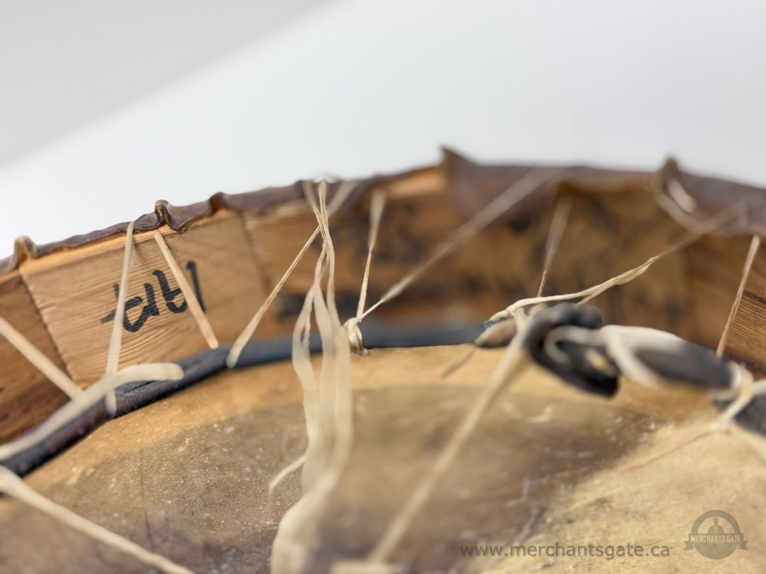 Hand painted frame drum featuring a wolf silhouette against a moon motif. Constructed with a wooden frame and stretched hide surface. The interior shows hand lacing and natural materials consistent with traditional frame drum construction. Artwork is painted directly on the hide surface.