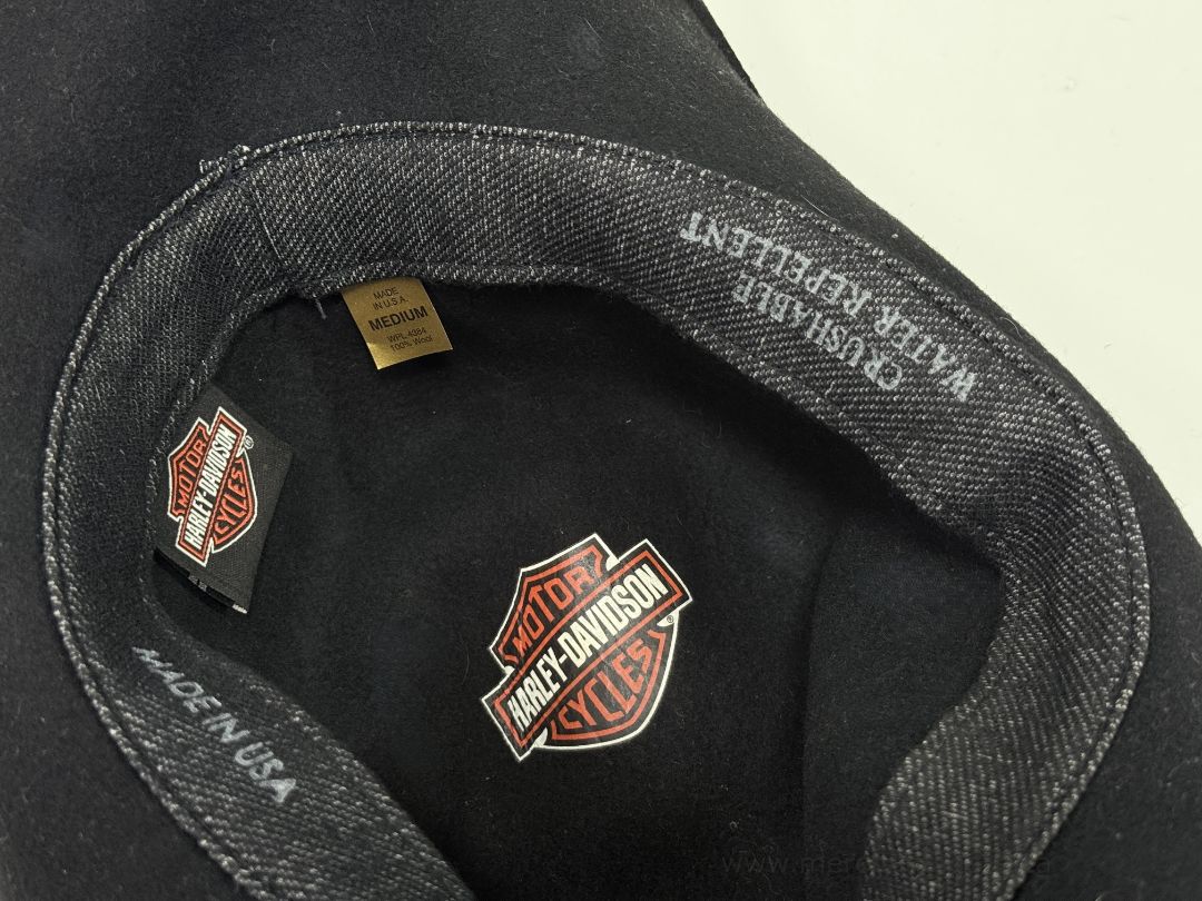 Features a leather hat band with tassel detail and classic western shape. Interior has the official Harley-Davidson logo and Made in USA label.