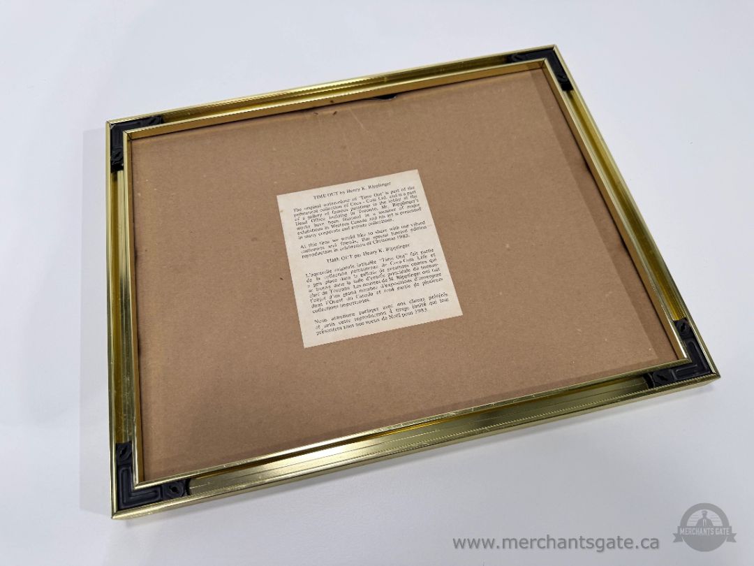 Framed print titled Time Out by Henry K. Rippelinger featuring a boy sitting outside a general store with a Coca Cola bottle and baseball bat. The artwork depicts a nostalgic small town scene with Coca Cola signage in the background. The back label identifies it as a reproduction of the original watercolor used in Coca Cola’s permanent collection.