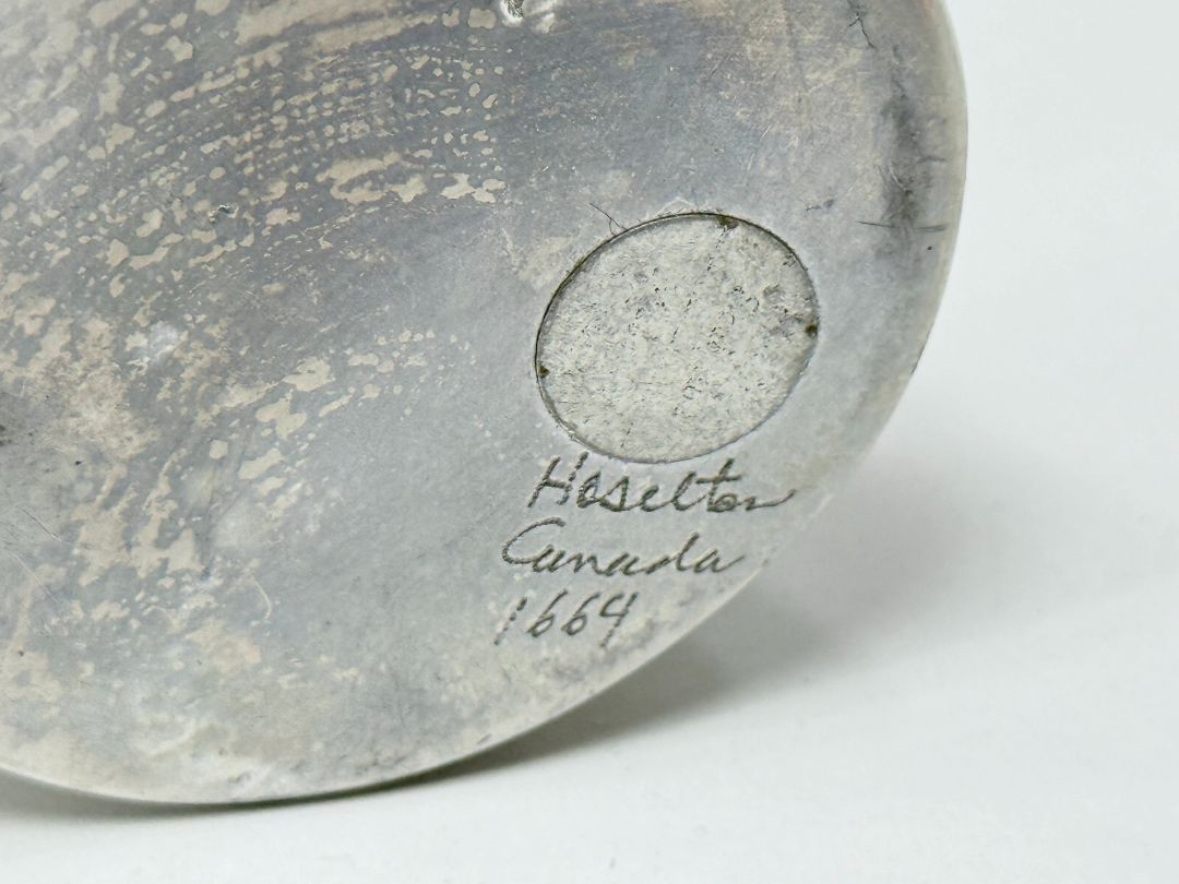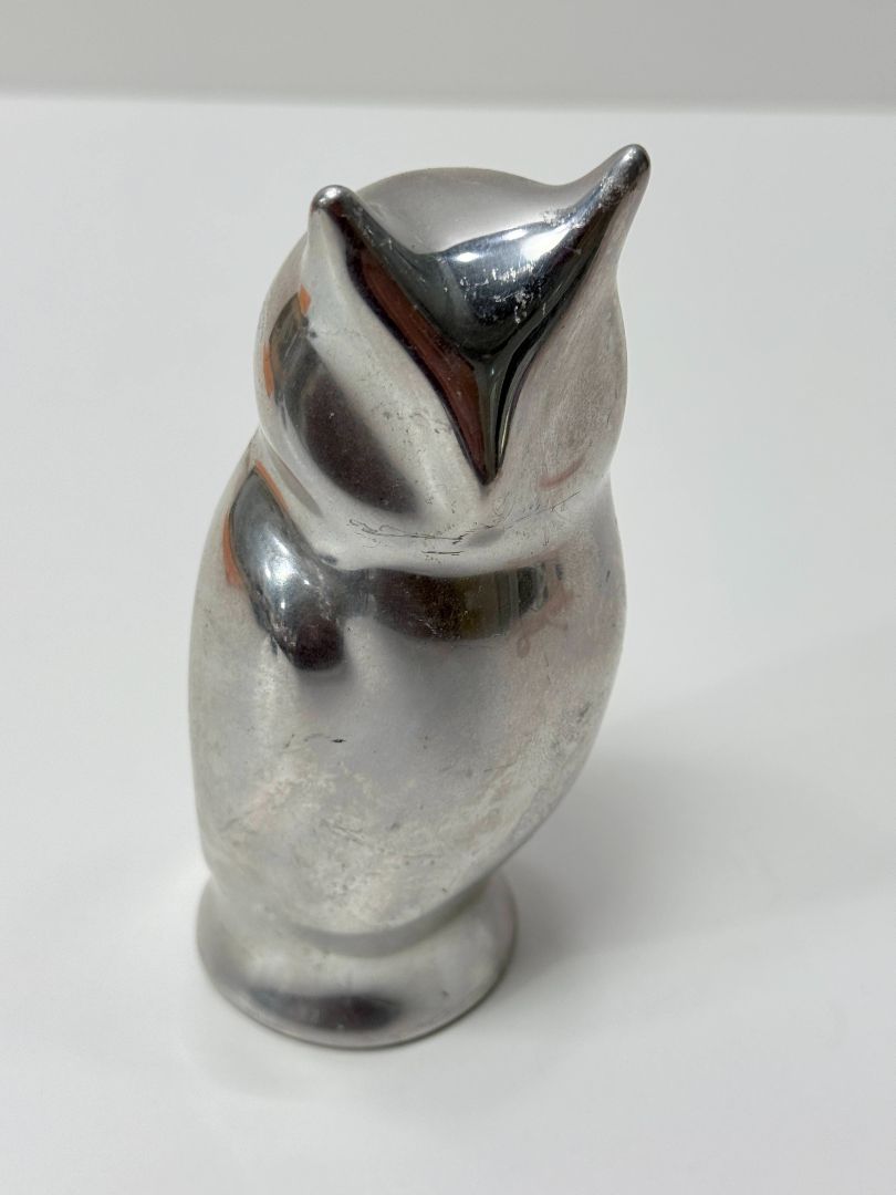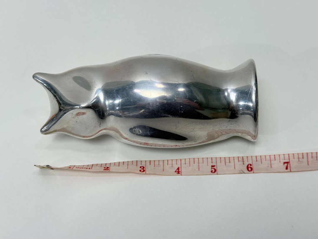 Signed Hoselton owl sculpture made in Canada, cast in solid aluminum. Modernist minimalist design with smooth polished finish. Measures about 6 inches tall and is signed Hoselton Canada 1664 on the base.