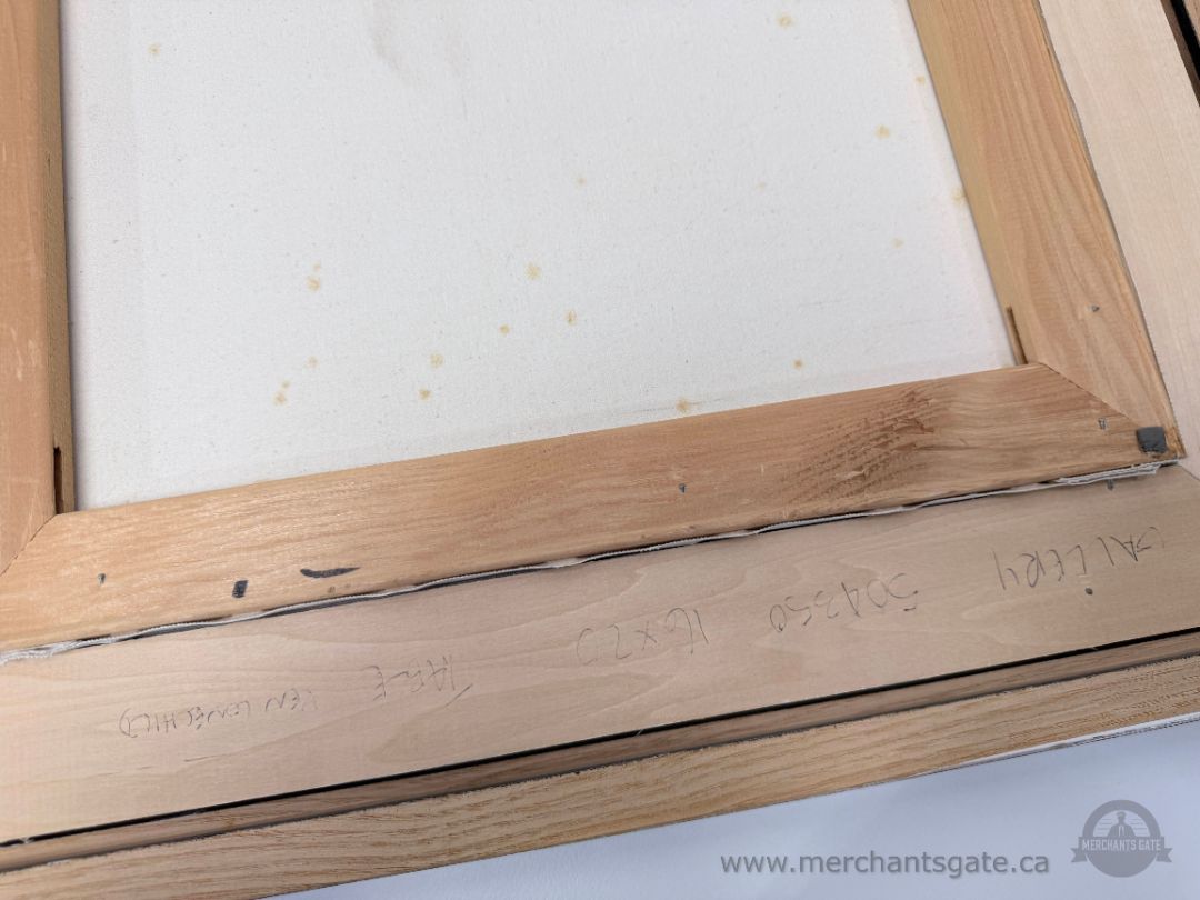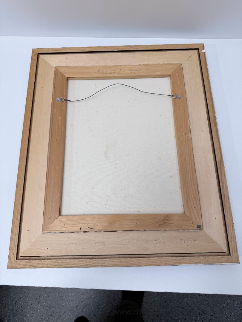 This is a print (not an original painting). The artwork presents well with strong colours and good detail. There is no glass in the frame. Matting and frame are in good overall condition. Some light age-related marks are visible on the backing, consistent with age.