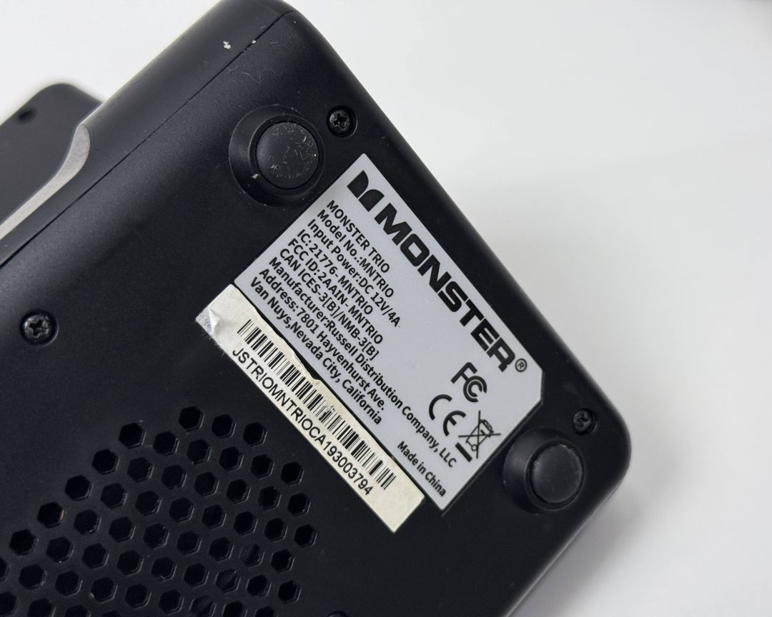 Monster Trio Bluetooth speaker and wireless charging dock with power adapter. Fully tested and working. Supports Qi wireless charging for compatible devices and includes dual USB ports on the back. Shows some cosmetic wear but functions perfectly. Great combo for charging and streaming music at your desk or nightstand.