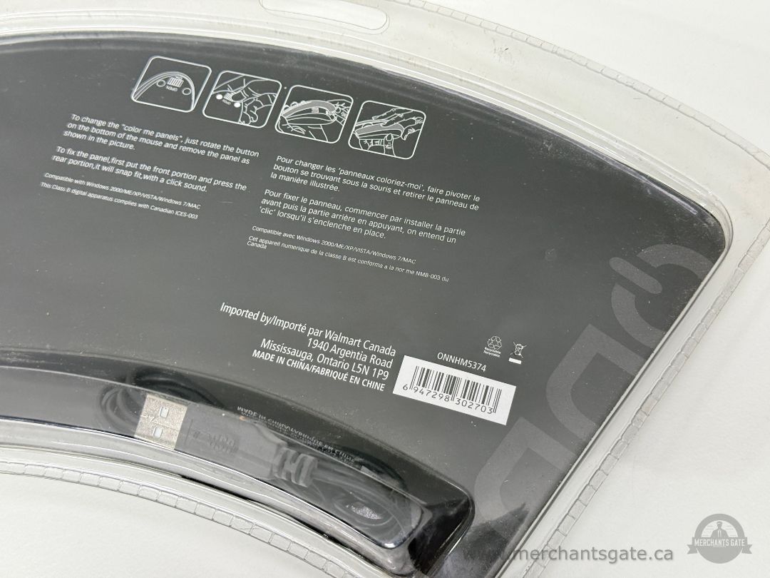 ONN optical mouse set new in sealed retail packaging. Includes one USB wired mouse with four interchangeable color panels in black, red, silver, and blue. Packaging shows light wear from storage. Compatible with USB 2.0 ports and common Windows operating systems as indicated on the package.