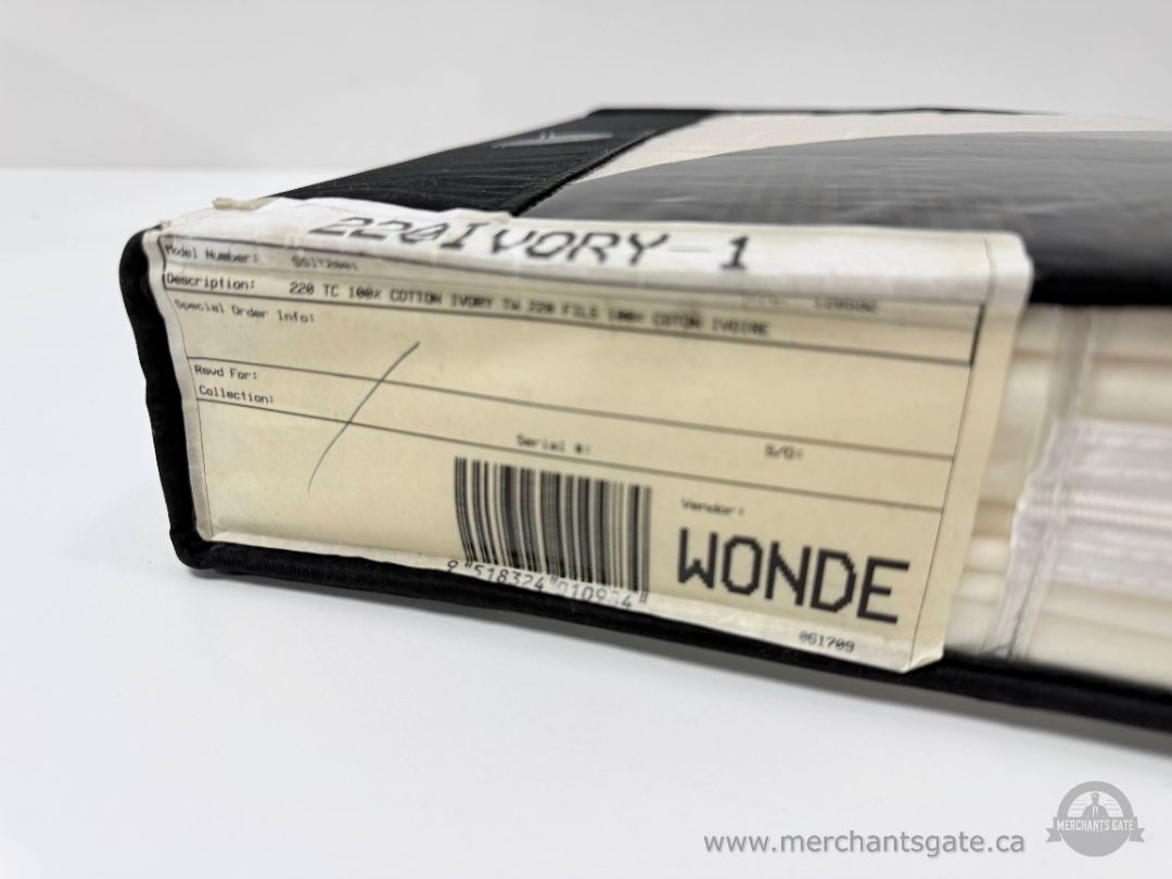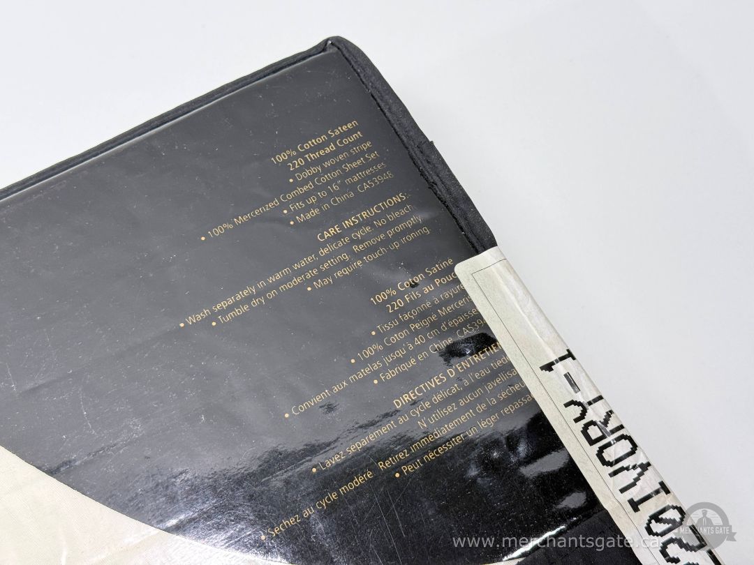 New twin size sheet set in ivory colour. 220 thread count, 100 percent cotton sateen fabric. Includes flat sheet, fitted sheet, and one pillowcase. Fitted sheet is designed to fit mattresses up to approximately 16 inches deep. Original branded storage case included.