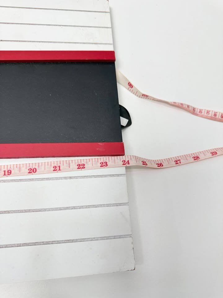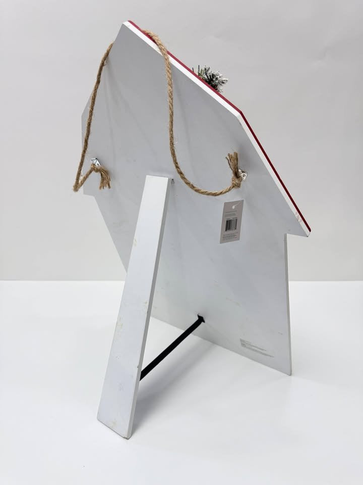 Countdown the days until Christmas with this rustic farmhouse-style barn sign. Features a snowy wreath with pinecones and berries, bold red roof accents, and a chalkboard section to update the countdown daily. Can be displayed standing with the back easel or hung with the rope handle. Approx. size: 23” tall x 15” wide.