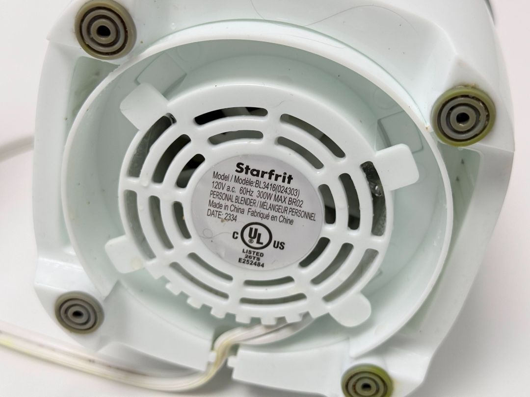 Compact Starfrit personal blender with 300W motor. Includes blending base, blade attachment, and cup. Perfect for smoothies, shakes, or quick blends with a simple dial control. Tested and works well.