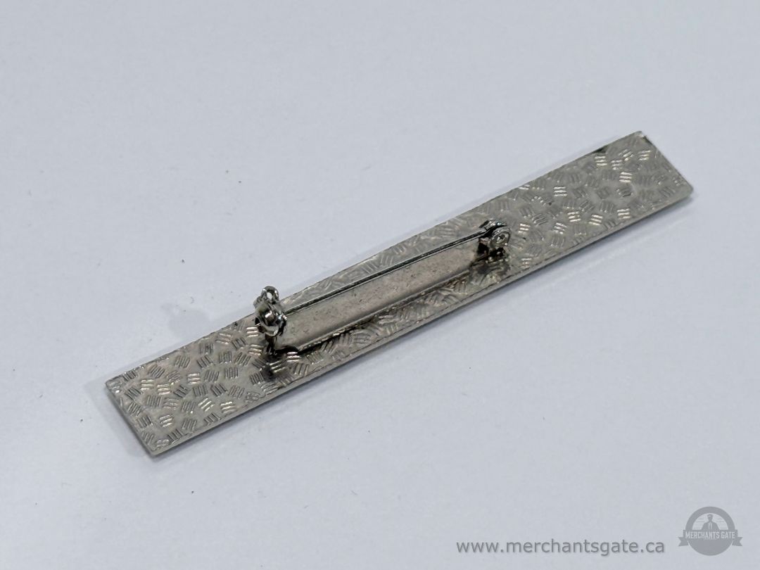 The brooch measures approximately 3" long. It is made of silver tone metal with gold tone accents and enamel decoration. The back has a standard pin clasp that opens and closes securely. Condition shows light wear consistent with normal age and use.