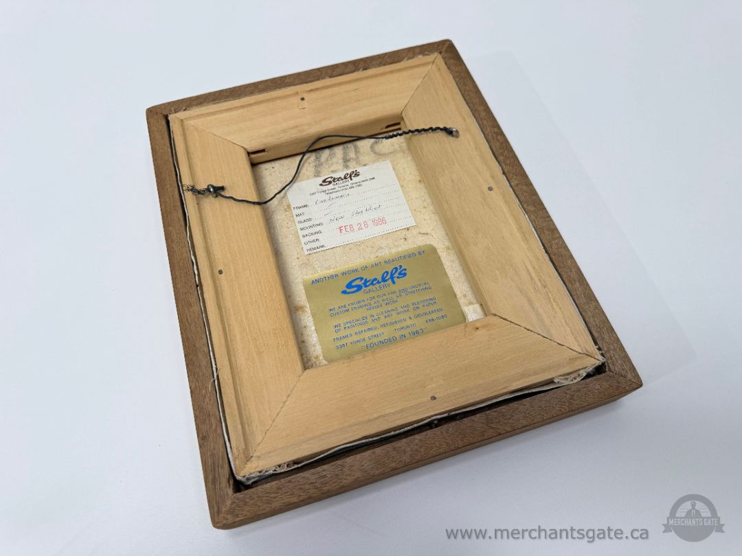 The piece is professionally framed by Strel’s Gallery, Toronto, with original gallery labels intact on the back. The framing label is dated February 28, 1986, indicating when the piece was framed. The gallery card notes new glass at the time of framing.