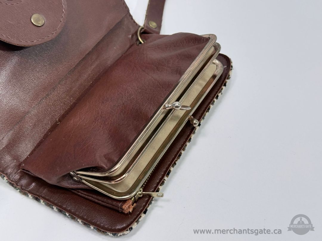 Vintage Houndstooth Tweed and Brown Leather Wallet Clutch Purse