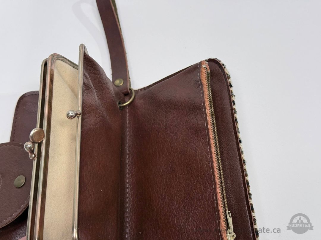 Vintage wallet or clutch featuring a houndstooth tweed exterior in cream, brown, and black tones with brown leather trim and wrist strap. The interior includes a metal frame coin compartment with kiss lock closure and a zippered pocket. Measures approximately 8 inches long.