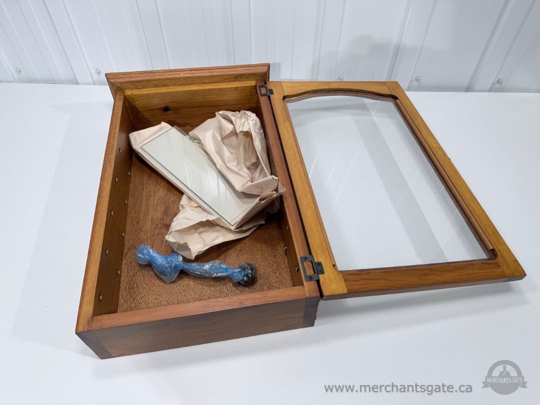 Condition is good overall with visible wear consistent with age, including minor surface scratches and small marks on the wood. Glass door is clear and intact with light surface wear. Glass shelves are included and appear free of cracks or chips. Mounting screws are not included.