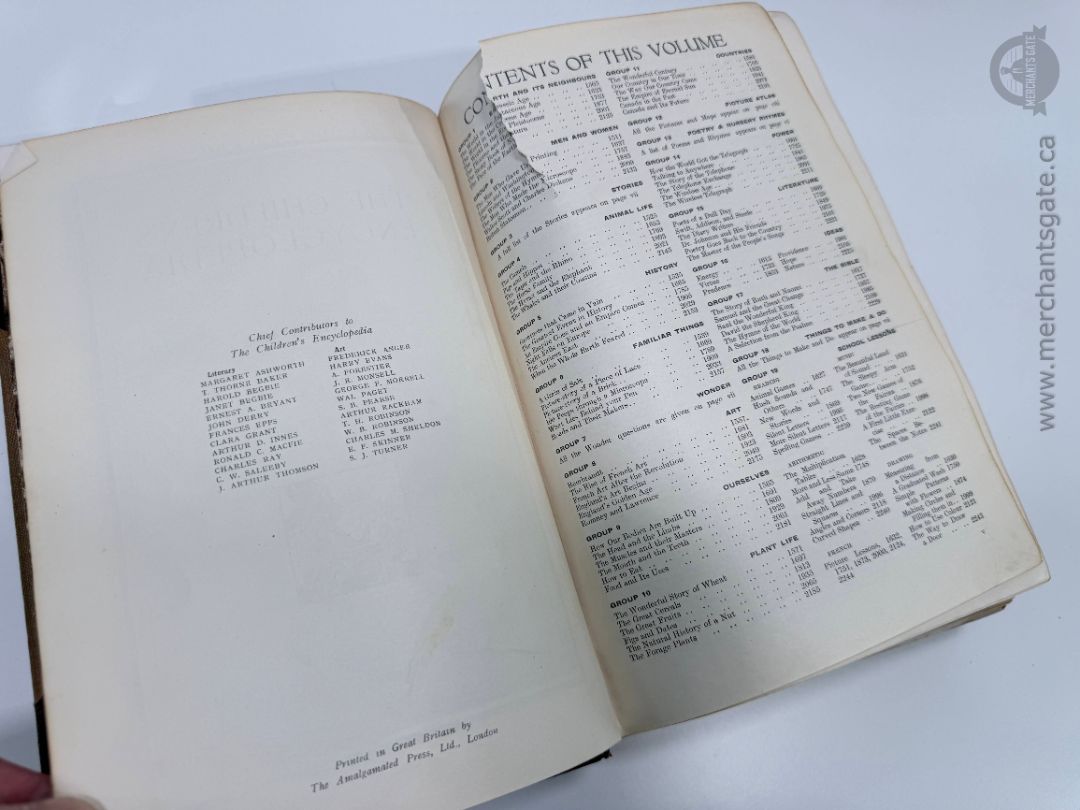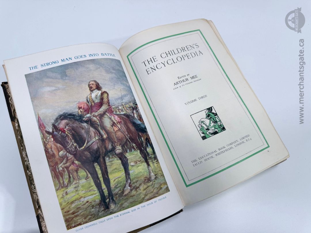 Complete 10 volume set of The Children’s Encyclopedia edited by Arthur Mee and published by The Educational Book Company Limited, London. Classic brown cloth hardcovers with ornate gold detailing on the spines and illustrated title pages throughout. Each volume is richly illustrated with color plates and black and white images, covering history, science, literature, nature, and more.