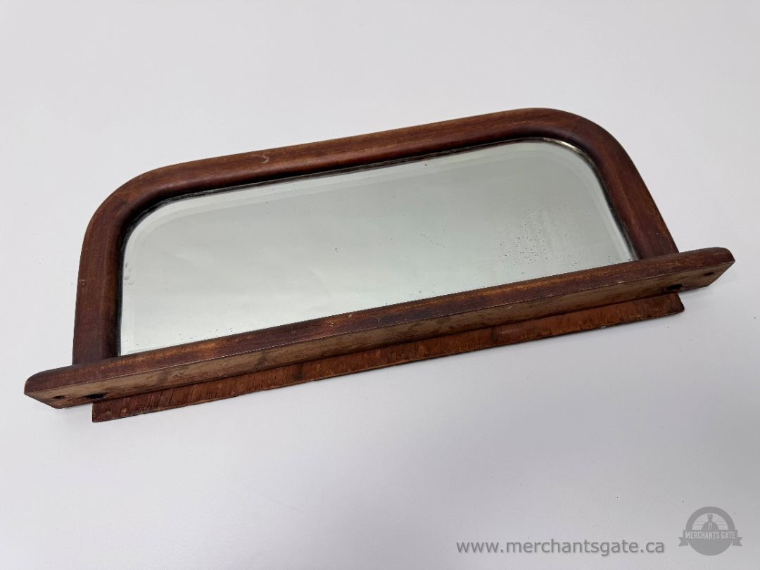 Vintage wall mounted mirror with a solid wood frame and integrated narrow shelf. Rectangular mirror with rounded corners set into a dark stained wooden surround. Shelf runs along the lower front edge and appears intended for small items such as grooming accessories. Back shows original wood construction with mounting holes.